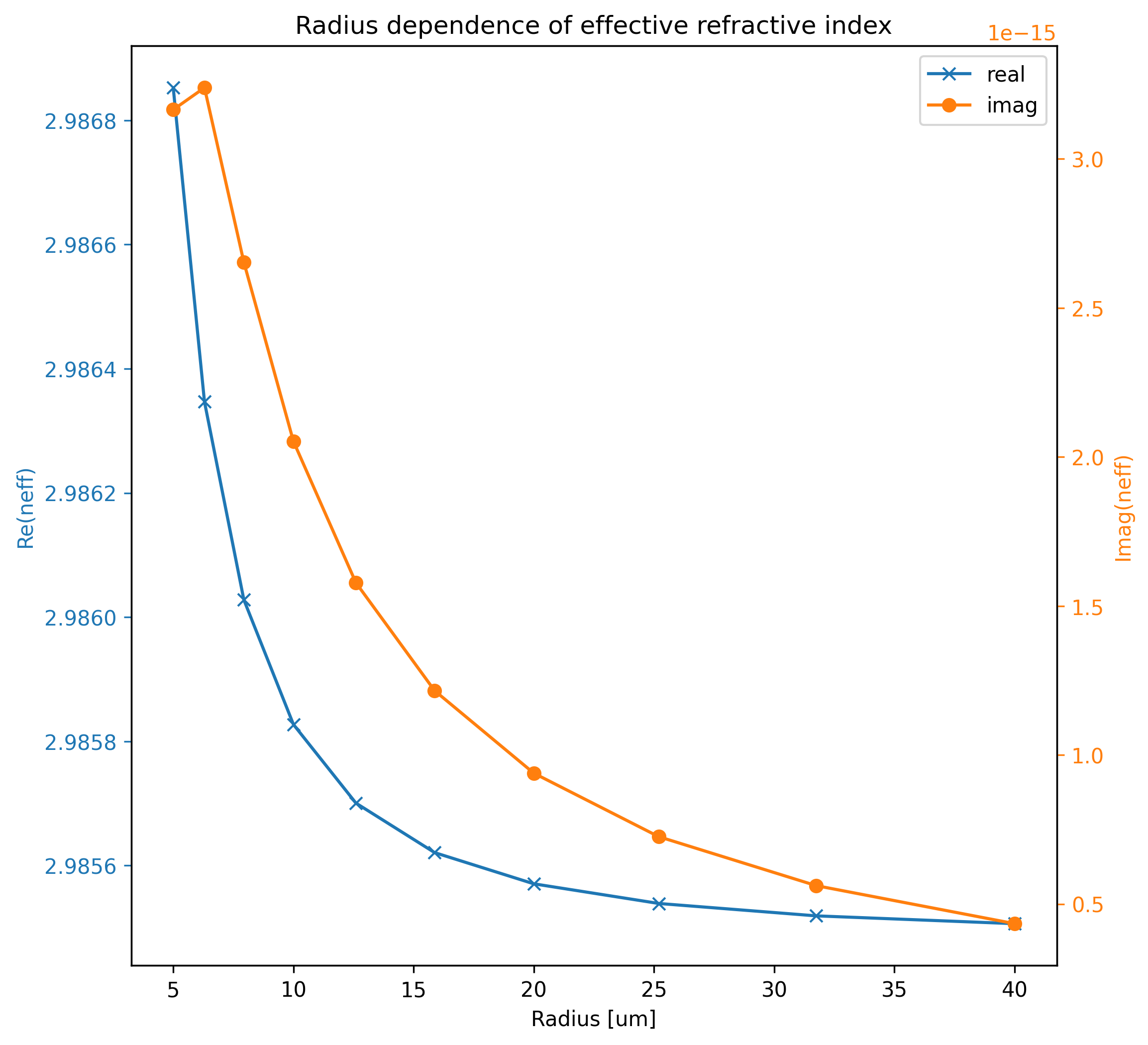 The following figure shows the radius dependence of effective refractive index in this example.