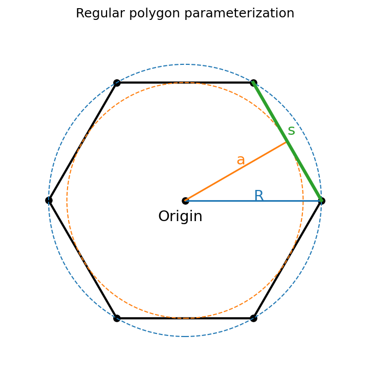 The parameterization of a regular polygon the SideLength s, Apothem a and the Radius R.¶